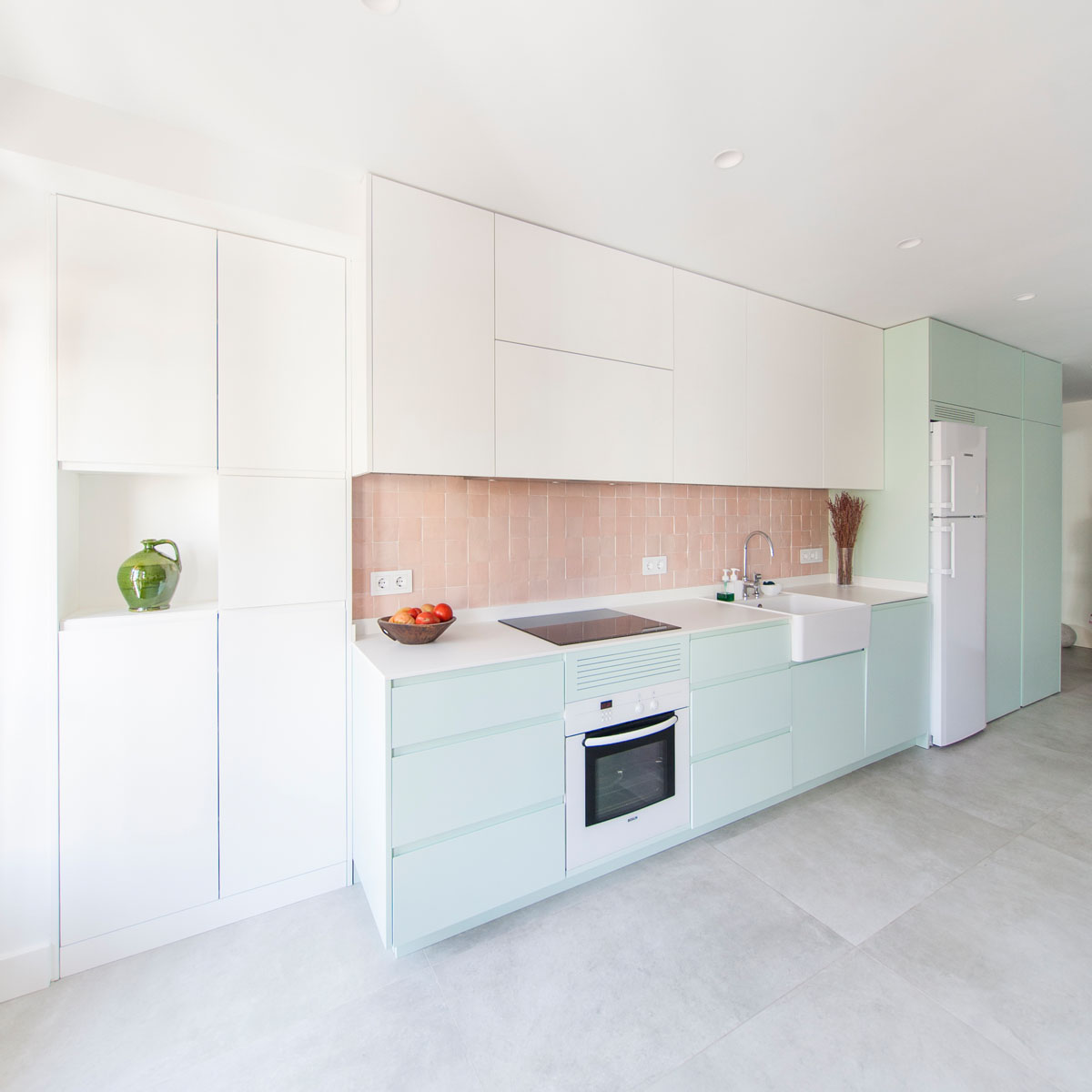 L3. Reforma integral. Espacio intercomunicado, pero claramente compartimentado. La reforma dispone de un sistema de climatización de aerotermia con techo radiante donde prima el confort térmico tanto en invierno como en verano. Los materiales elegidos son zellige para zonas húmedas, suelo porcelánico gran formato en toda la vivienda y muebles a medida con acabados lacados. Se usa el papel en pared combinado con la pintura.